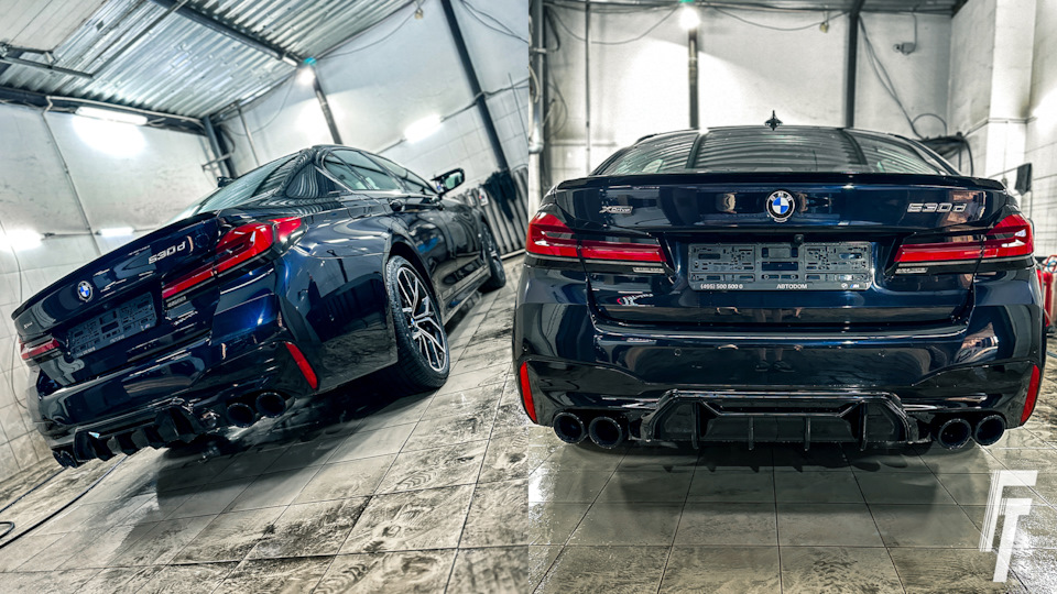 Мы предложили проверенный комплекс из трёх элементов, которые работают в связке именно на кузове G30: насадки, диффузор, спойлер. Это классическая тройка для преображения задка пятой серии.