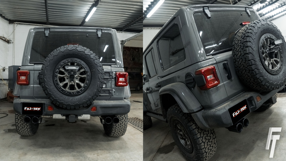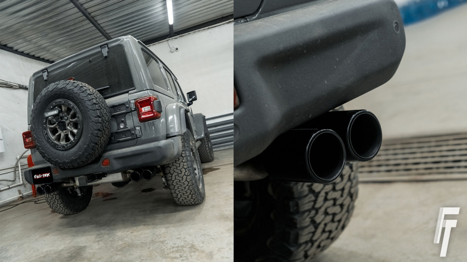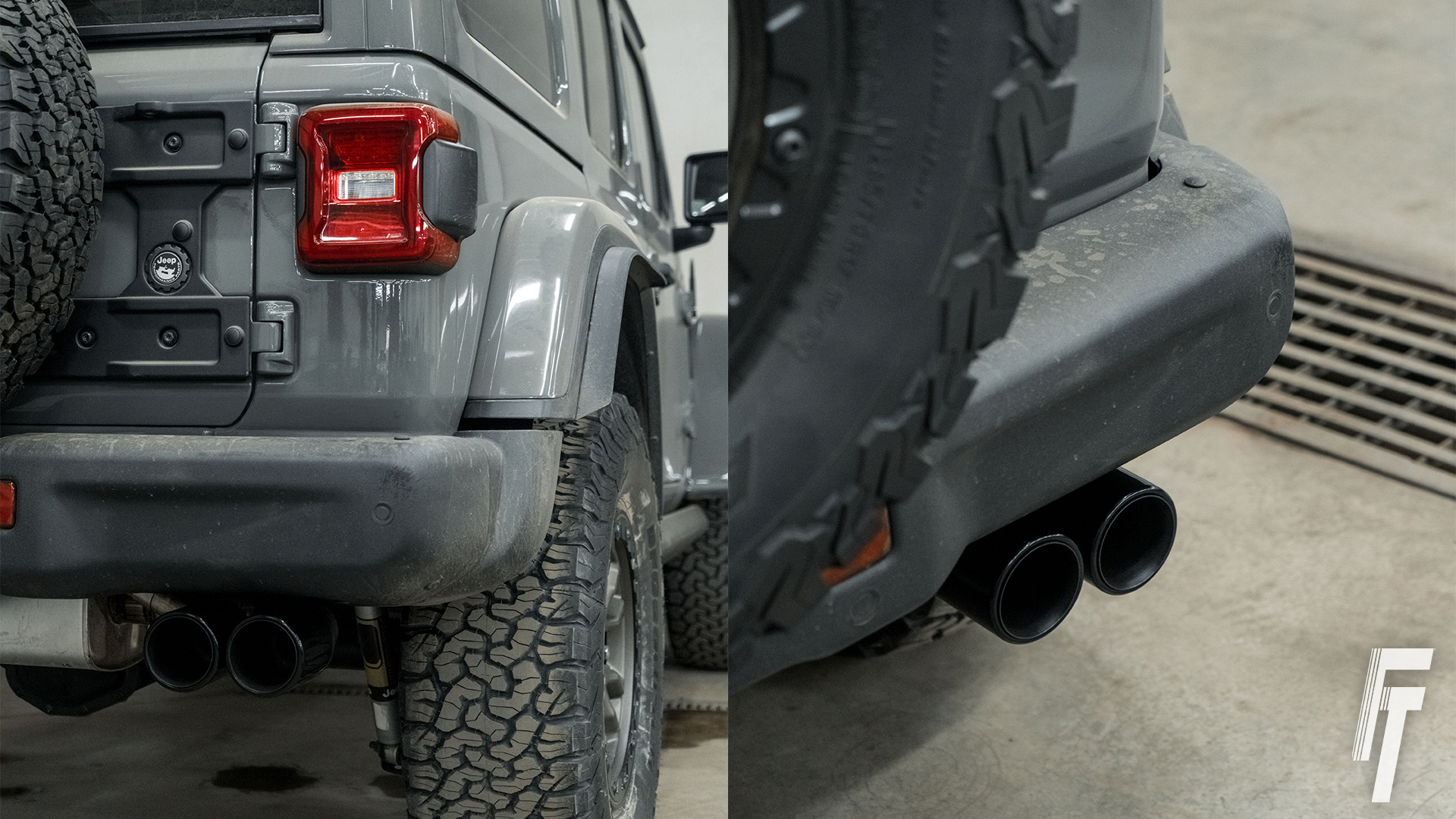В качестве финального элемента были выбраны сдвоенные насадки диаметром 90 мм, покрытые жаростойкой порошковой краской черный глянец. Такое покрытие хорошо подходит для эксплуатации в любых условиях и гармонично сочетается с дизайном задней части Wrangler