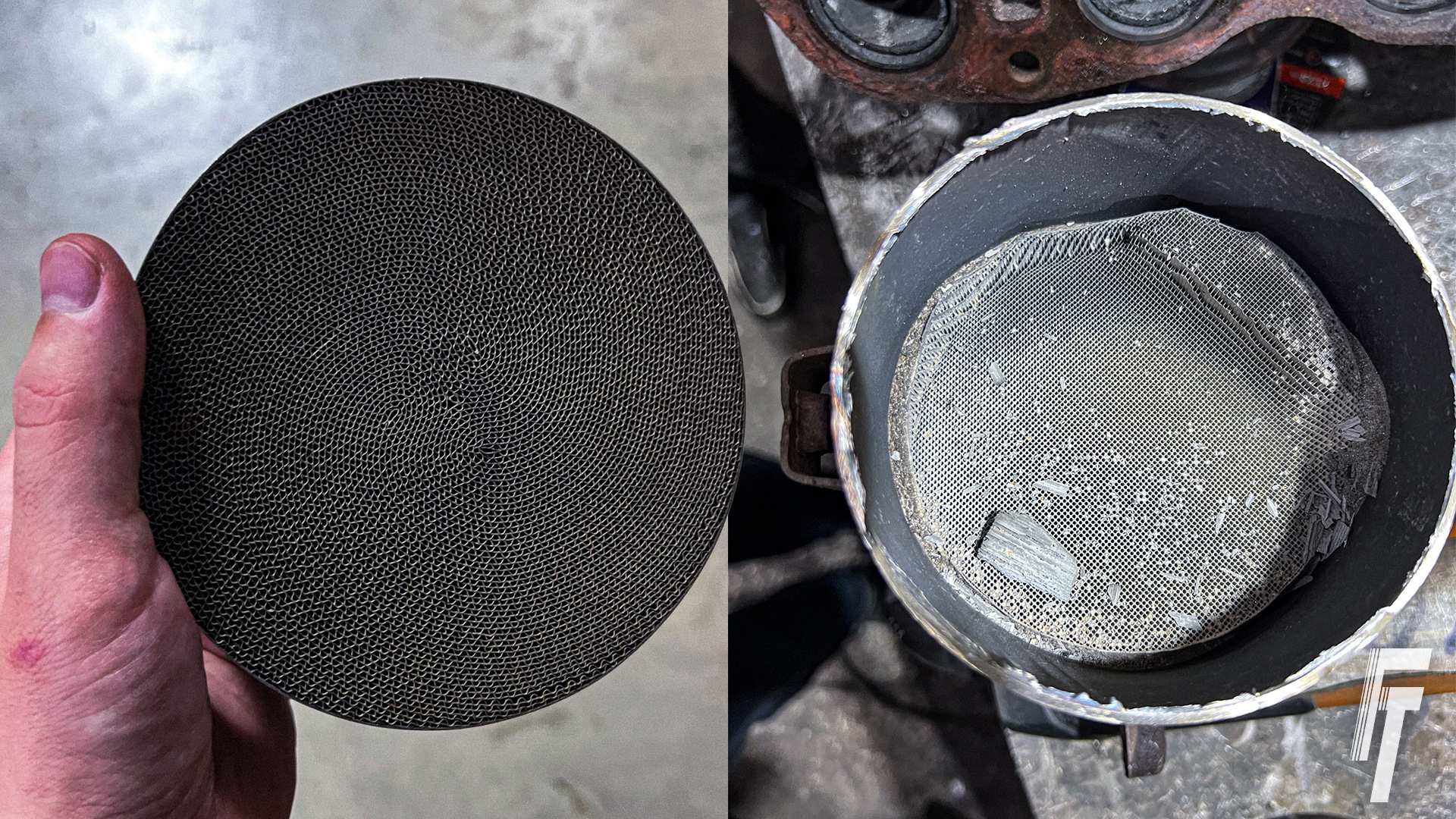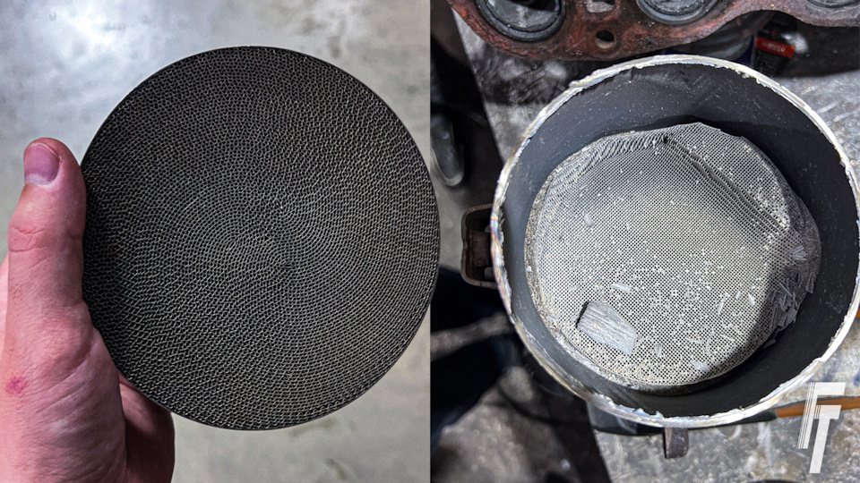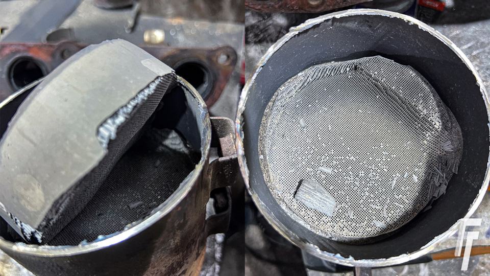 В ходе диагностики выяснилось, что внутренний блок катализатора разрушен и раскрошился на части. Это довольно типичная ситуация для таких пробегов — керамическая структура катализатора со временем деградирует из-за температуры и вибраций, а частицы могут попасть обратно в цилиндры, что грозит уже гораздо более серьёзными последствиями.