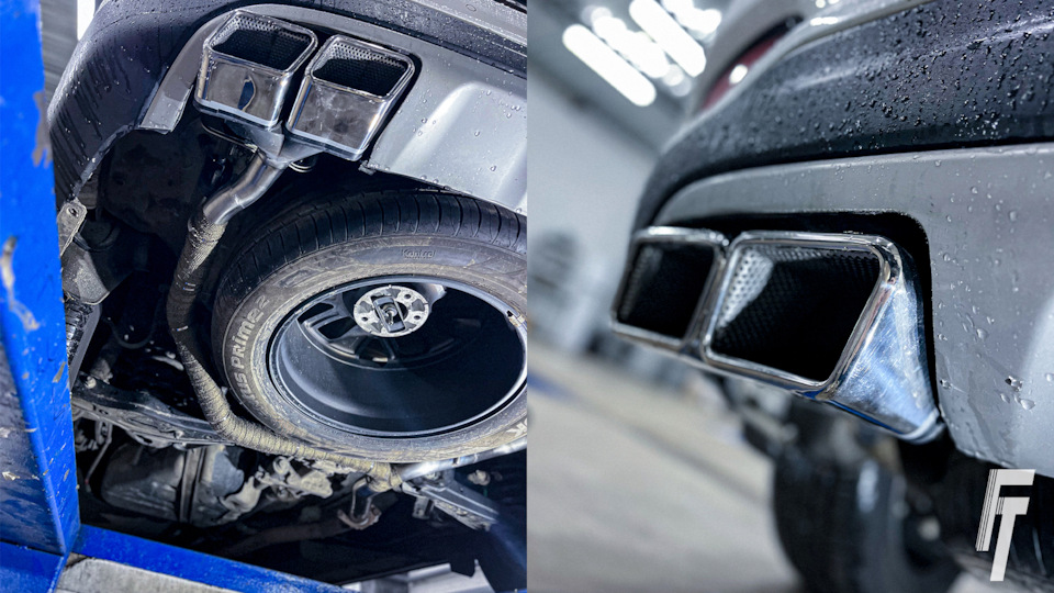Клиент выбрал насадки трапециевидной формы из полированной нержавеющей стали AISI 304. Такая форма смотрится современно и агрессивно. Полировка придаёт завершённый вид.
