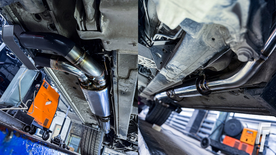 Проблема: Если поставить downpipe и сразу глушитель, звук получается слишком громким, «пустым» и резким, с неприятными высокочастотными гармониками. Это дискомфортно и в салоне, и для окружающих.