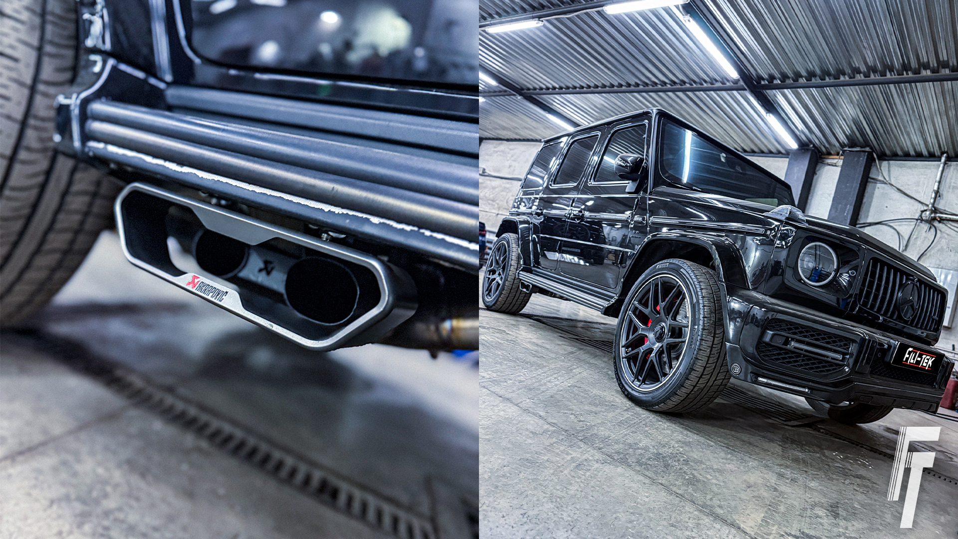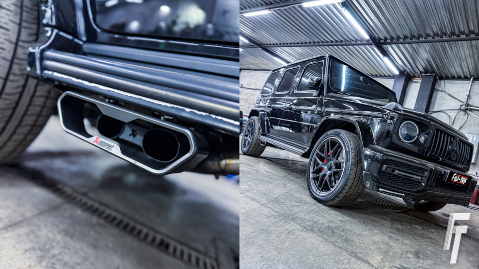 Новый выхлоп с Downpipe и насадки Akrapovic на Mercedes G63 (W463) из Кореи